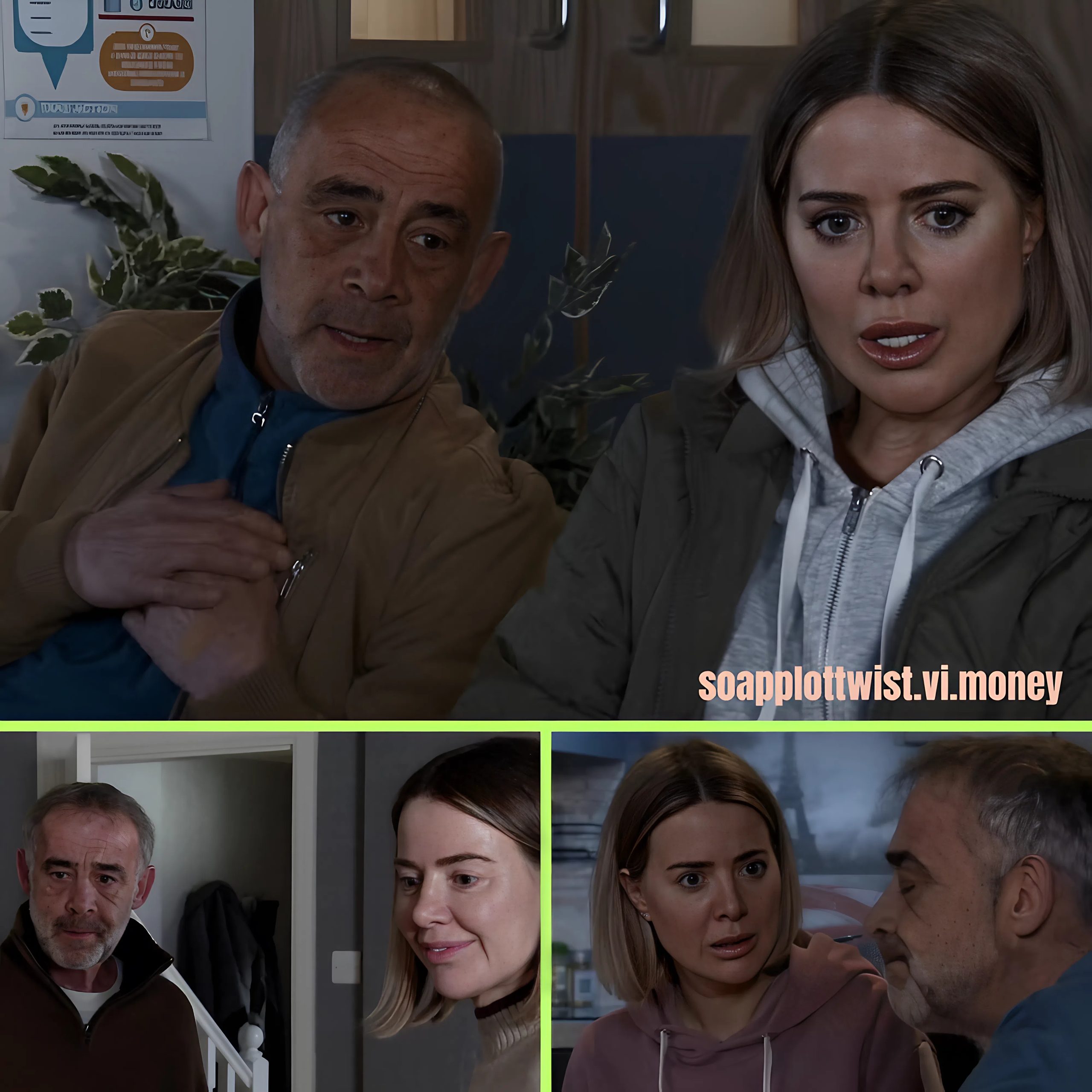 She sends a panicked text to Carl to warn him that Kevin knows the truth – and then realises she’s sent the text to Kevin by mistake. Carl desperately tries to get his hands on Kev’s phone before Kevin sees anything. Is the game up?