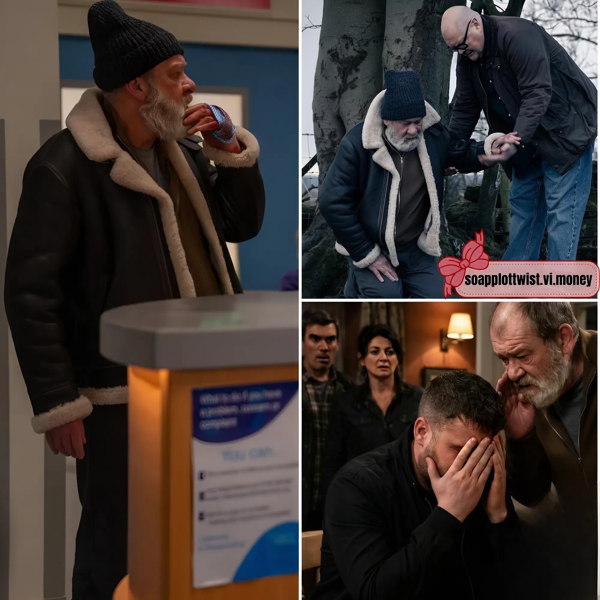 Bear arrives at a hospital desk in Emmerdale