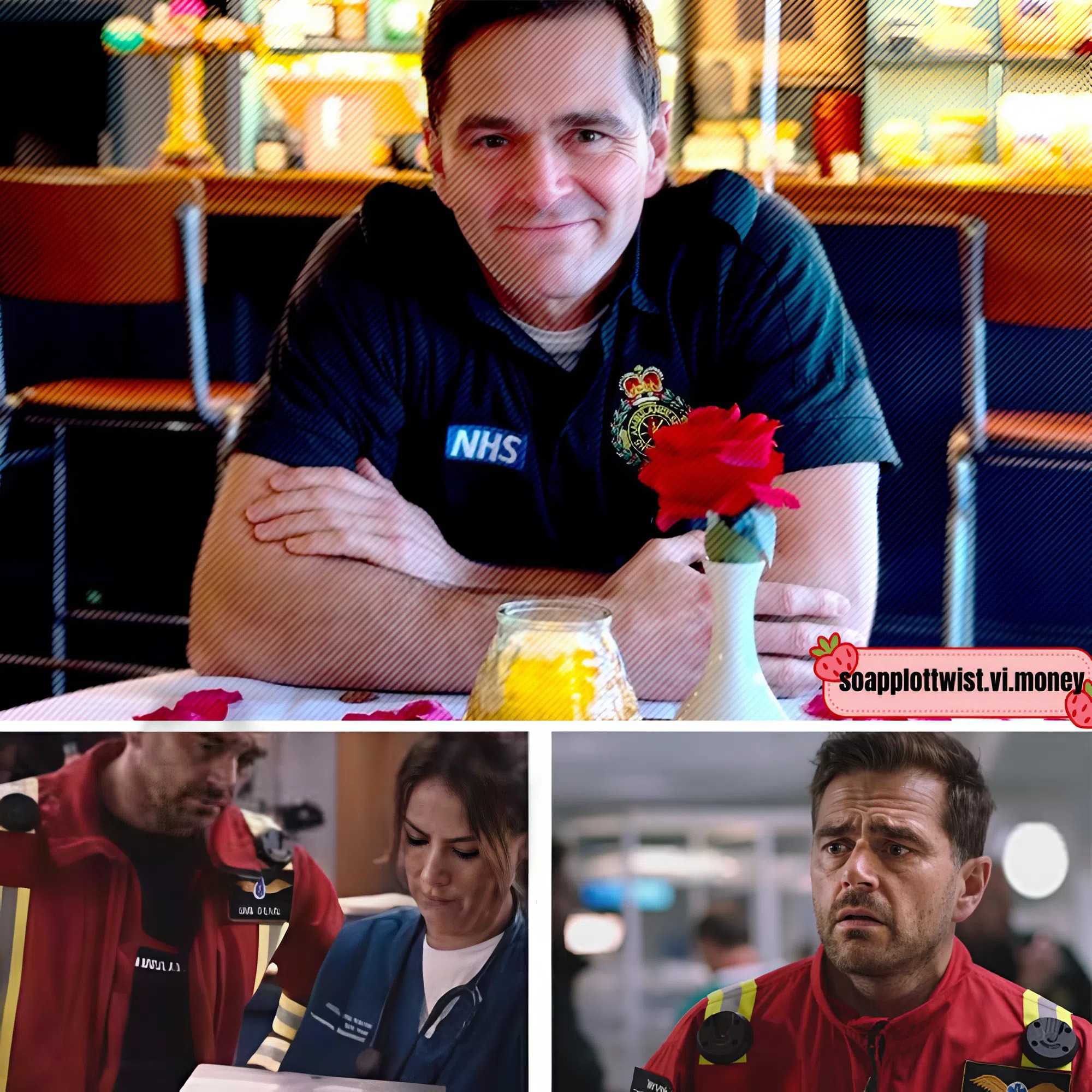 In one of the new images, Stevie can be seen holding a blood bag and standing in front of a Christmas tree baring a serious expression, while another snap sees Iain looking worried as he sits the driver’s seat of an ambulance with Christmas lights twinkling in the background.