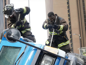 The episode featured heart-stopping stunts, including a stunt performer jumping onto a ladder while a car fell from a window, and another actor leaping onto a moving car only to fall off as it was pulled through a wall. Rain-soaked angles added to the intensity, making viewers question if Severide would survive the chaos.