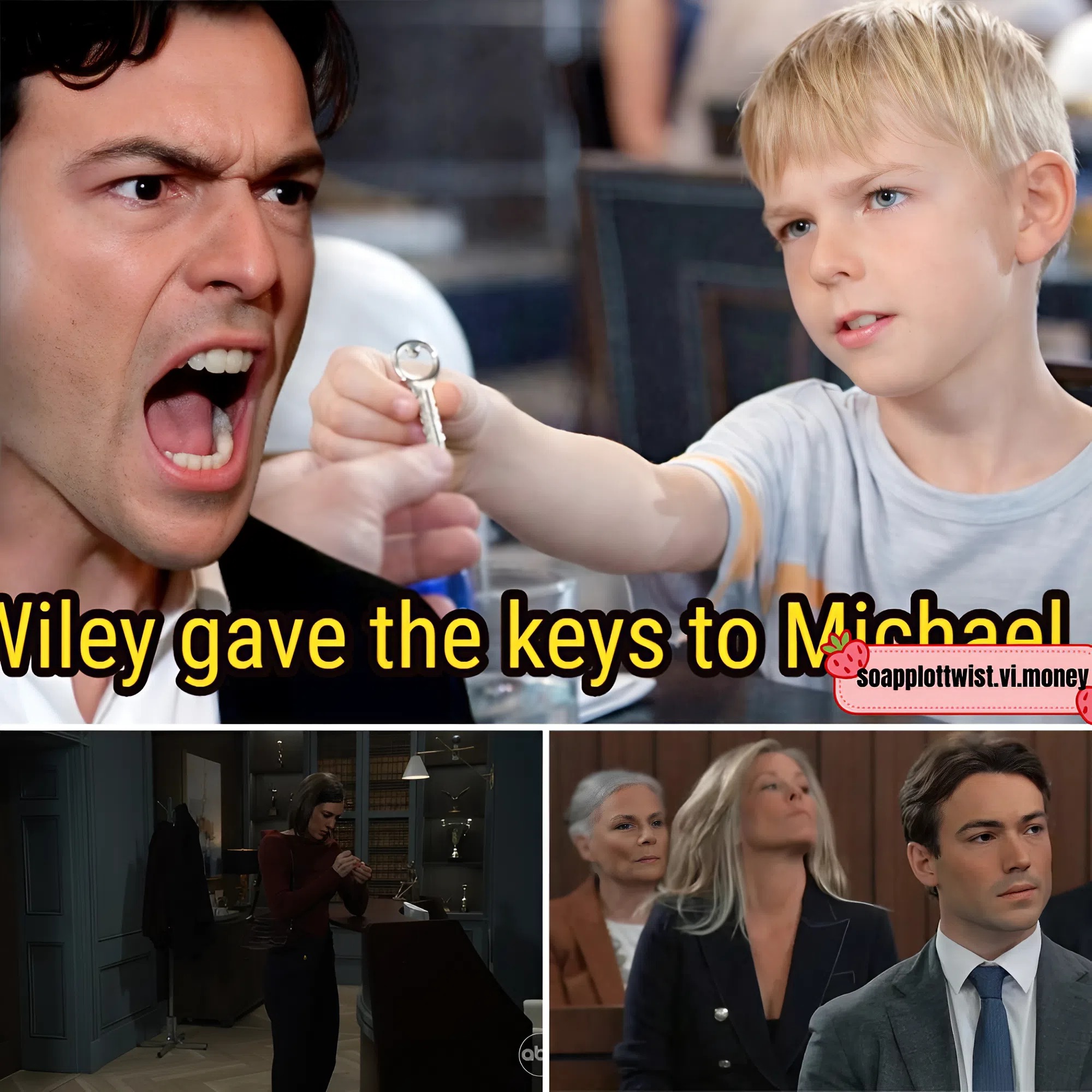 Wiley has always been portrayed as quiet, observant — the kind of child who listens more than he speaks and absorbs adult tension like weather. But recently, something shifts. A few stray moments he didn’t understand at the time begin looping in his mind like a broken film reel: Chase slipping a key ring from Michael’s jacket. Chase crouching down with hurried determination, placing that same key ring on the floor as if it were evidence… or a weapon. The sharp edge in the adults’ voices, the way conversations stopped the second he entered the room, the way people smiled too quickly — as if a smile could erase fear.