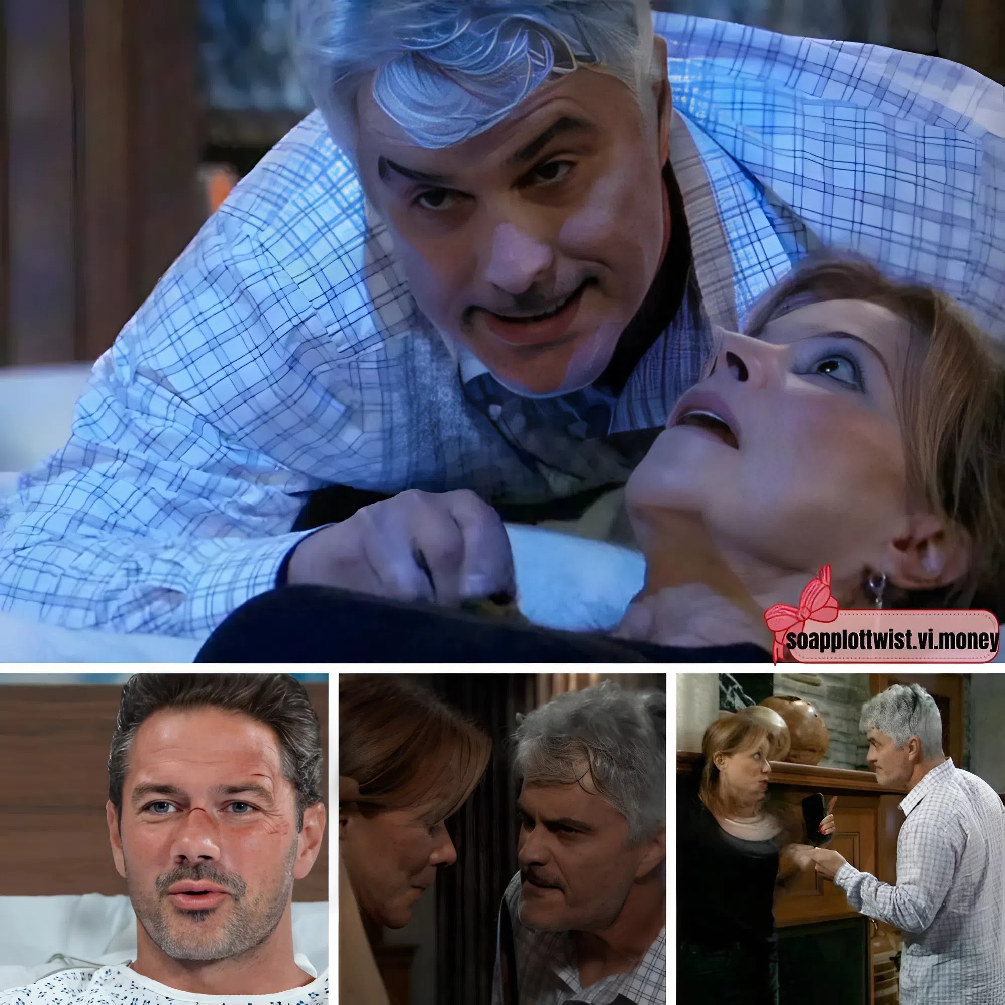 At her place, Alexis talks to her assistant, Suzanne, on the phone about what’s on her docket tomorrow, which includes the reading of Monica’s will. Ric lurks in the background, and when Alexis gets off the phone and lounges back on the couch, he puts Helena’s dagger to her throat.